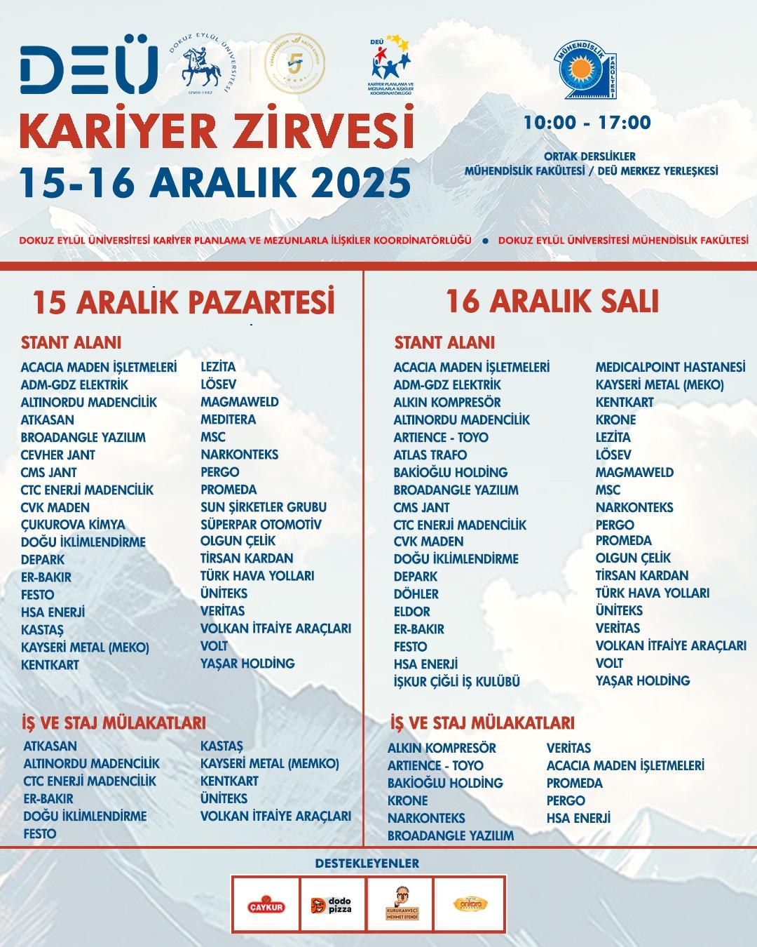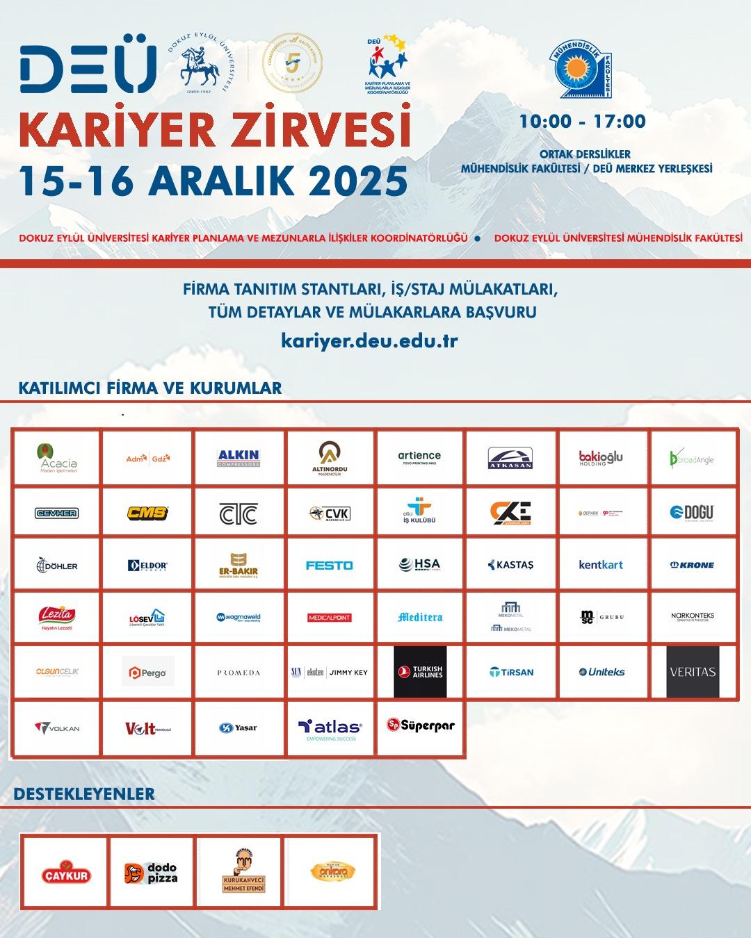 Kariyer Planlama ve Mezunlarla İlişkiler Koordinatörlüğü ve DEÜ Mühendislik Fakültesi iş birliği ile 15-16 Aralık 2025 (Pazartesi-Salı) tarihlerinde DEÜ Merkez Yerleşkesinde, Mühendislik Fakültesi Ortak Derslikler Binası‘nda gerçekleştirilecek olan DEÜ Kariyer Zirvesi 2025 etkinliğine ilişkin duyuru aşağıda yer almaktadır.
