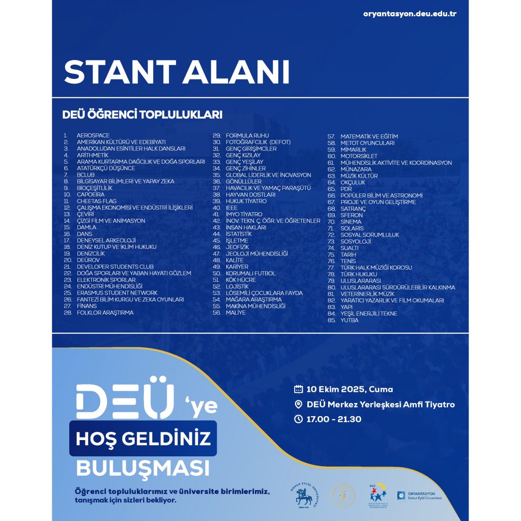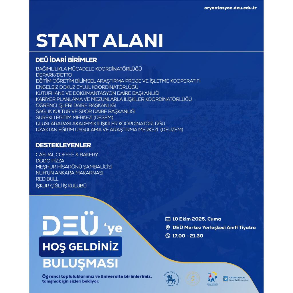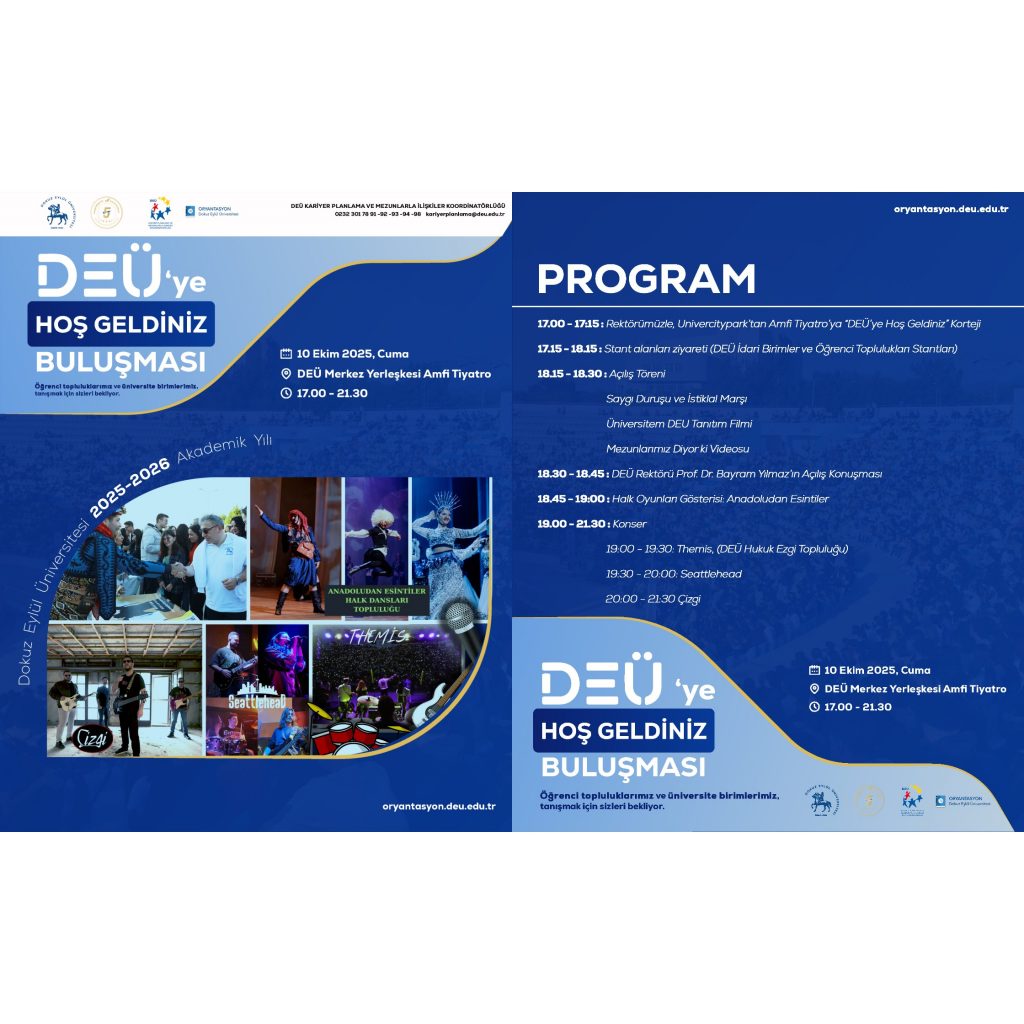 Dokuz Eylül Üniversitesi 2025-2026 öğretim yılı fakülte/yüksekokul/meslek yüksekokullarının birinci sınıf öğrencilerine yönelik “DEÜ’ye Hoş Geldiniz Buluşması” etkinliği 10 Ekim 2025 saat 17.00’de Merkez Yerleşkesi Amfi Tiyatroda gerçekleştirilecektir. Tüm birinci sınıf öğrencileri tam katılımla saat 16.30’da kortej yürüyüşüne beklenmektedir.