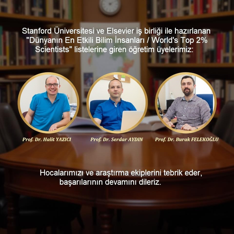 Stanford Üniversitesi ve Elsevier iş birliğiyle yayımlanan dünyanın en etkili %2 bilim insanı listelerinde (World’s Top 2% Scientists List) öğretim üyelerimiz Prof. Dr. Halit YAZICI, Prof. Dr. Serdar AYDIN ve Prof. Dr. Burak FELEKOĞLU yer almıştır. Hocalarımızı kutlar, başarılarının devamını dileriz. (Kaynak: https://elsevier.digitalcommonsdata.com/datasets/btchxktzyw/8)
